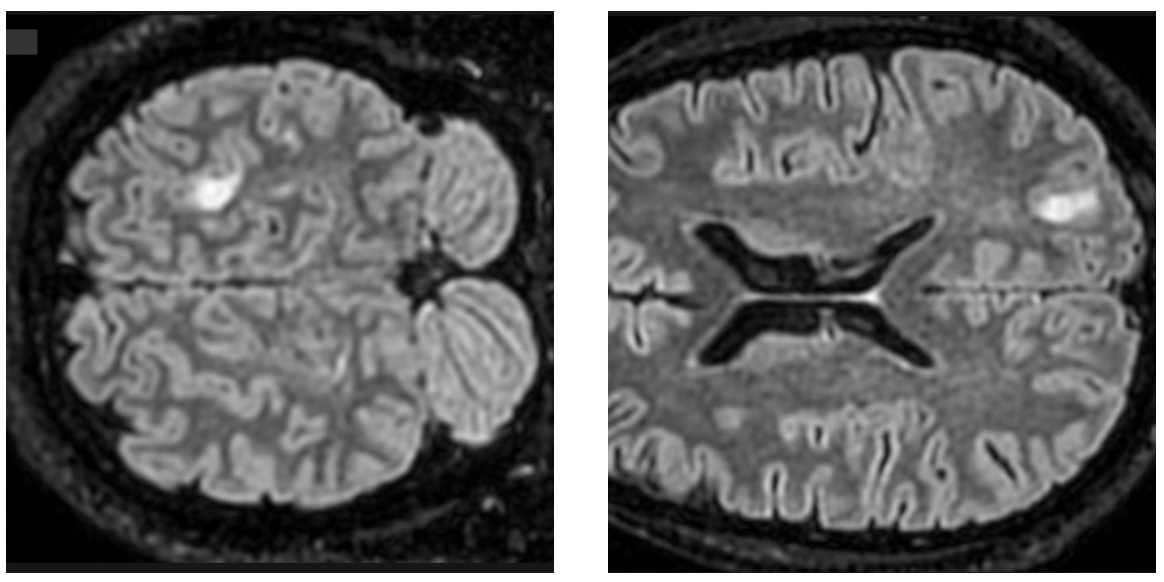 Adjunto el informe de RM cerebral con contraste. La conclusión describe múltiples focos bilaterales, con lesión cortical parietal posterior izquierda con captación en anillo sin restricción de difusión, y plantea como posibilidad una lesión neoplásica glial multifocal con foco de mayor agresividad parietal izquierdo, considerándose menos probable etiología infecciosa o desmielinizante. Solicito derivación preferente a Neurocirugía/Neuro-oncología para valoración de biopsia estereotáxica y planificación de pruebas complementarias (RM avanzada perfusión/espectroscopia o punción lumbar si procede).